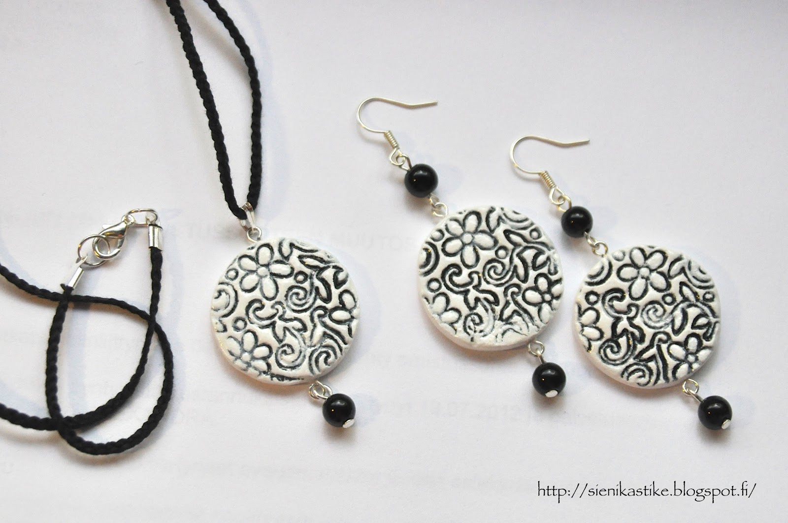 Комплект. ПГ Fimo Air, бусины - это какой-то камень, уже забыла, какой именно :( Шнур сделан из мулине. Рисунок, а точнее, рельеф, сделан с применением штампа, причём пасхального :) Это предполагалось быть узором на яичке. Нравится мне этот узор) Кстати, вы его уже видели здесь.