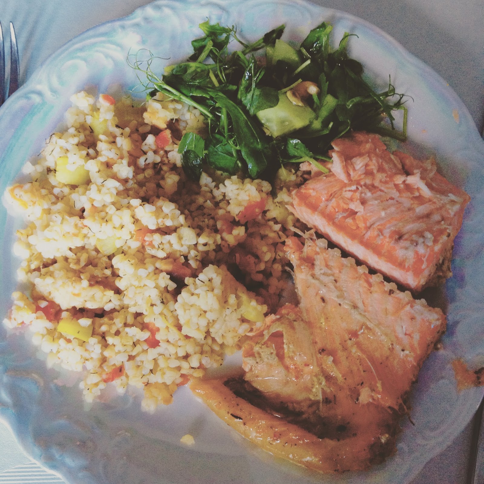 | Чт. Лосось, запечённый в пакете для запекания, вчерашний булгур с овощами, салат из свежих овощей. |